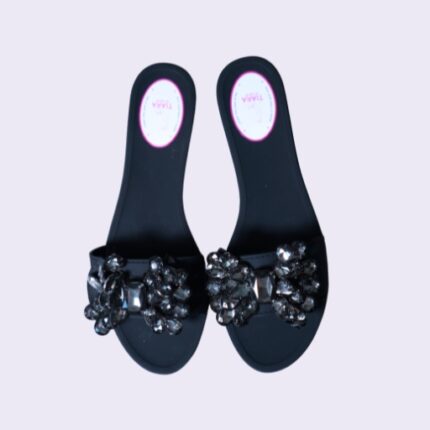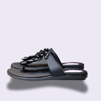 The simple black strap is beautifully adorned with a vibrant beaded geometric stripe in striking colors like red, yellow, and green. This tribal-inspired detail adds a unique, bohemian flair to the classic flip-flop design. Ideal for beach trips, pool days, or pairing with denim shorts and flowy maxi dresses.